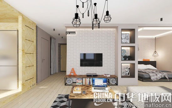木地板装修效果图一:木地板从玄关一直延伸到客厅,奠定了浅色调的空间色彩基础,电视背景墙用白砖来打造,透着一丝粗犷的怀旧意味。矮电视柜和墙面空间为收纳提供了场所。