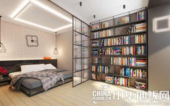 木地板装修效果图五:与卧室相连的是书房,占据了整面墙的铁艺书架上摆满了形形色色的书籍,充分利用了墙面空间,将收纳效能充分发挥。(文中图片来源于网络)