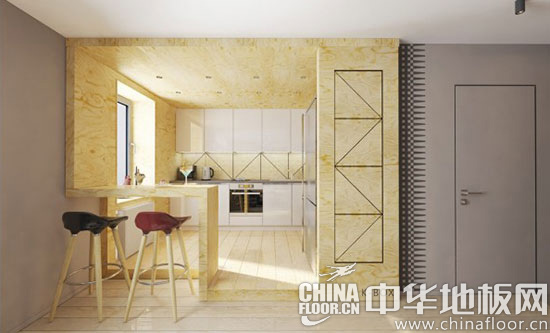 木地板装修效果图三:厨房采用了半开放式的格局设计,由木质吧台将厨房与客厅分隔开来。保证了视觉上的通透感和延伸感。浅原木色是厨房空间的主色调,搭配白色橱柜,显得清新而温暖。稍高于客厅的地面,充分考虑到了卫生清洁的特殊要求。