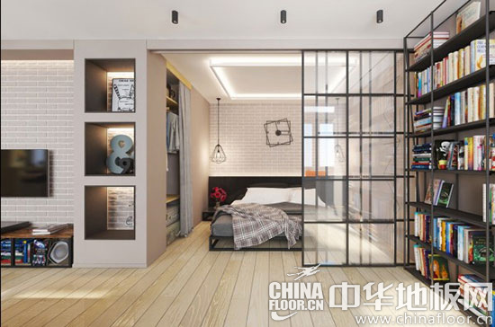 木地板装修效果图四:一铺到底的浅色木地板从客厅一直延伸到卧室,让空间在视觉上有着延伸感。客厅与卧室之间用玻璃推拉门隔开,将门拉开即可形成一个开放通透的整体家居空间,关上卧室门,就能保证居住隐私。卧室内的衣柜以内嵌式来打造,更加节省占地空间。