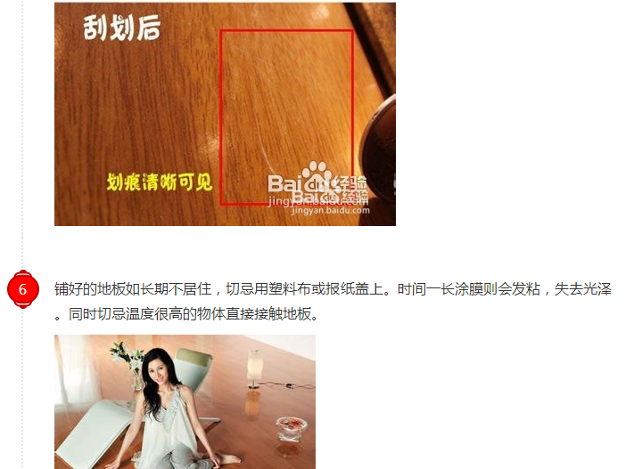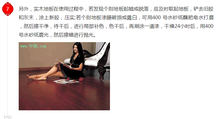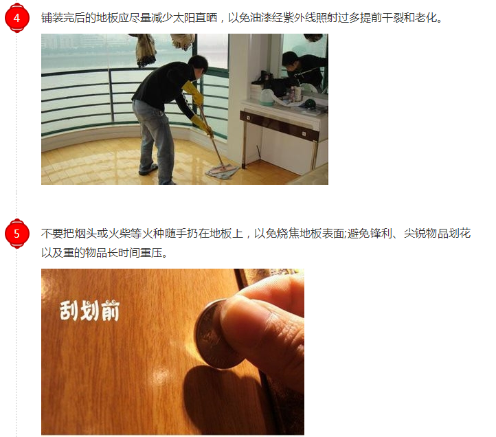 实木地板含水率一般保持 8~13%,这样的地板在正常情况下,一般不会出现问题。但使用不当也会造成实木地板出现质量问题,比如:用水淋湿或用碱水、肥皂水擦洗,这样会破坏油漆 的光亮度;卫生间和房间地面没有做好隔离;夏季没有注意拉好窗帘,使得窗前地板经灼热阳光曝晒后变色开裂;或是空调温度开得过低,使白天和晚上温差变化过 大,引起地板膨胀或收缩过于剧烈而造成变形开裂等。